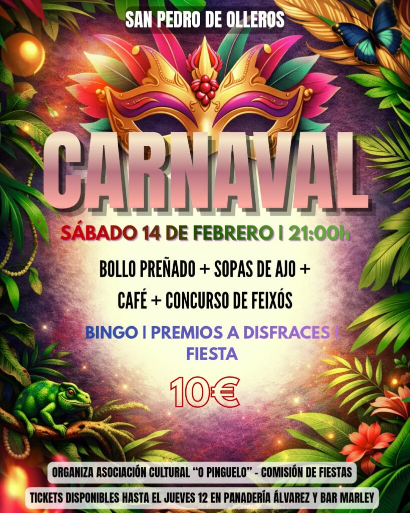 El sábado 14 de febrero a las 21:00 h, San Pedro de Olleros celebra su Carnaval con una noche completa de diversión 🎉.