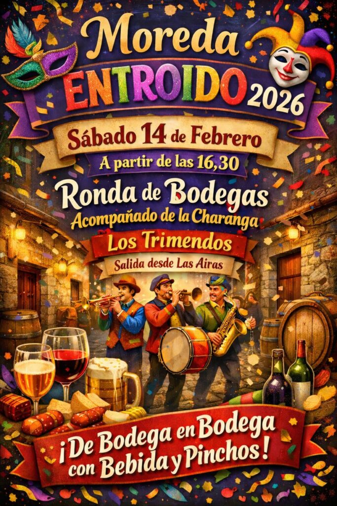 El sábado 14 de febrero, a partir de las 16:30 h, vive el Entroido en Moreda con una animada ronda de bodegas 🍻 acompañada por la charanga Los Trimendos 🎶.