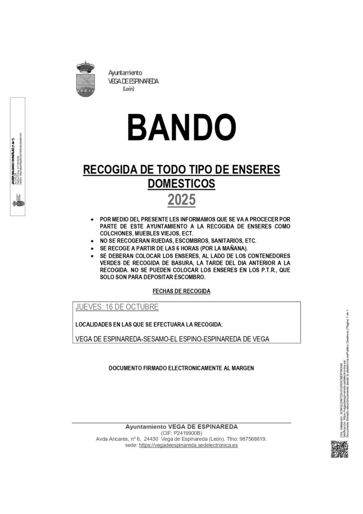 El Ayuntamiento de Vega de Espinareda informa a todos los vecinos que el jueves 16 de octubre de 2025 se realizará un servicio especial de recogida de enseres domésticos en las siguientes localidades: