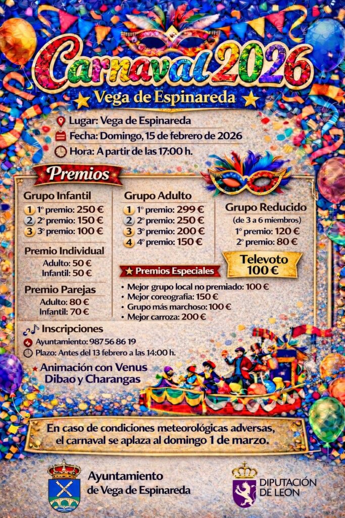 ¡Disfraces, música, premios y mucha diversión para todas las edades!📅 Domingo 15 de febrero de 2026⏰ Desde las 17:00 h📍 Vega de Espinareda🎉 Participa en el gran desfile de Carnaval con premios para grupos infantiles, adultos, grupos reducidos, parejas e individuales, además de premios especiales a la coreografía, carroza y al grupo más marchoso.🎺🎶 Animación […]